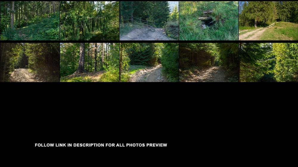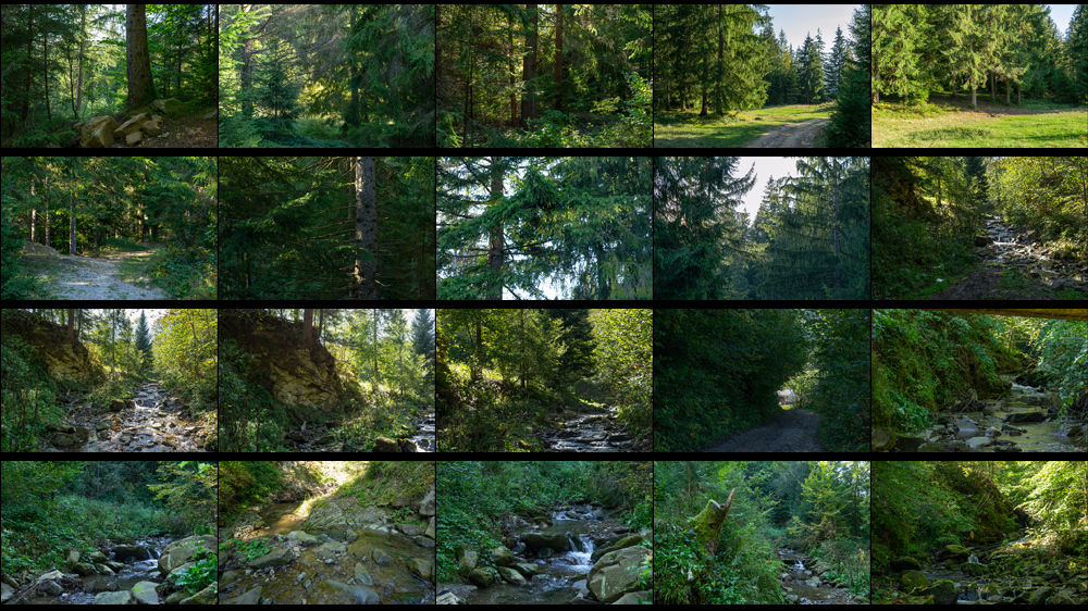This pack is featuring photo references of the summer Carpathian Forest near Yaremche, Ukraine (pine and mixed forest on the hills, huge stone ridges and mossy rocks, mountain slopes and forest paths, river thresholds and waterfalls) and was gathered to be used as a source for matte painting and concept art. For personal and commercial usage.